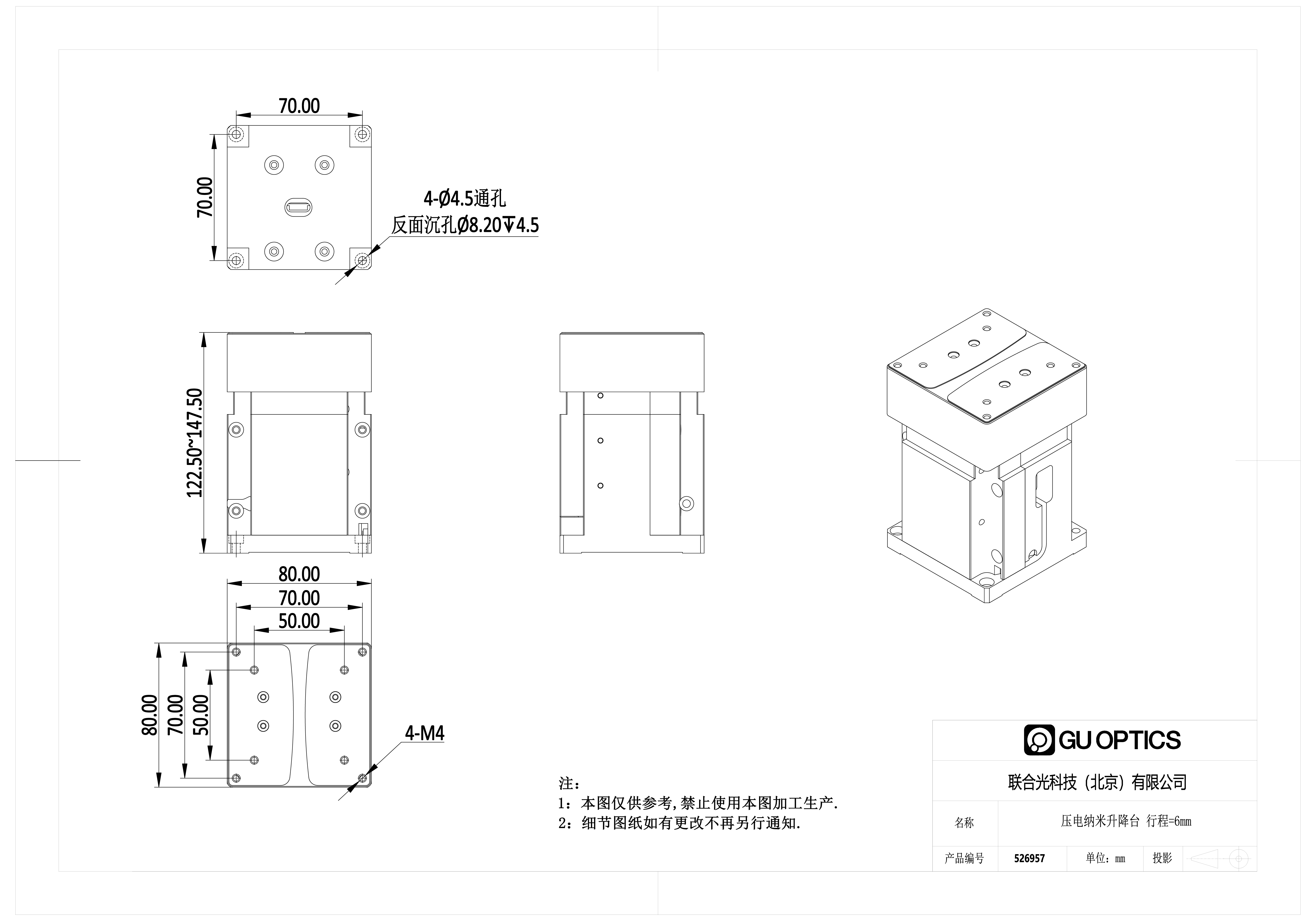 *锲型结构设计,单/双压电马达驱动 *断电自锁,内具刹车功能,无回程间隙 *最小步进距离小于20nm *可选配磁栅或光栅位置反馈 *结构紧凑,可以和其他位移台直接叠堆成模组