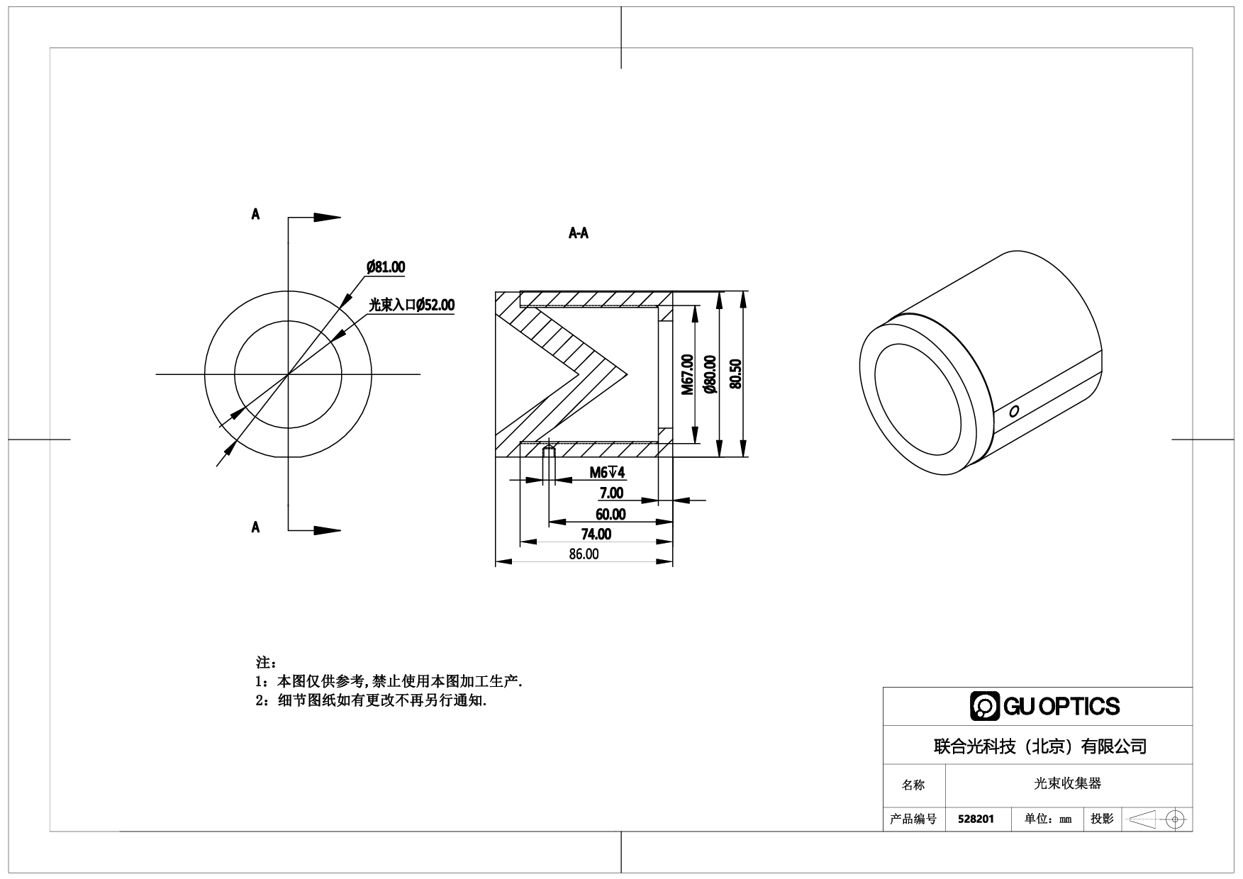 联合光科的光束收集器提供光束入口直径12mm和25mm的两种规格,用于收集光路尾端多余激光和能量,避免尾光造成的伤害,光束收集器的底端带有M6的螺孔,便于连接支撑棒固定在光学平板上。