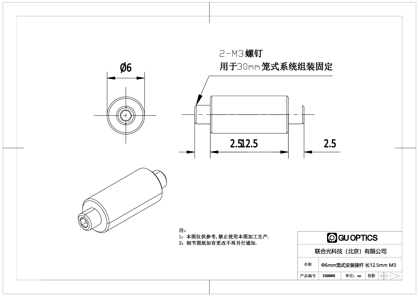Φ6mm笼式安装接杆 长12.5mm M3