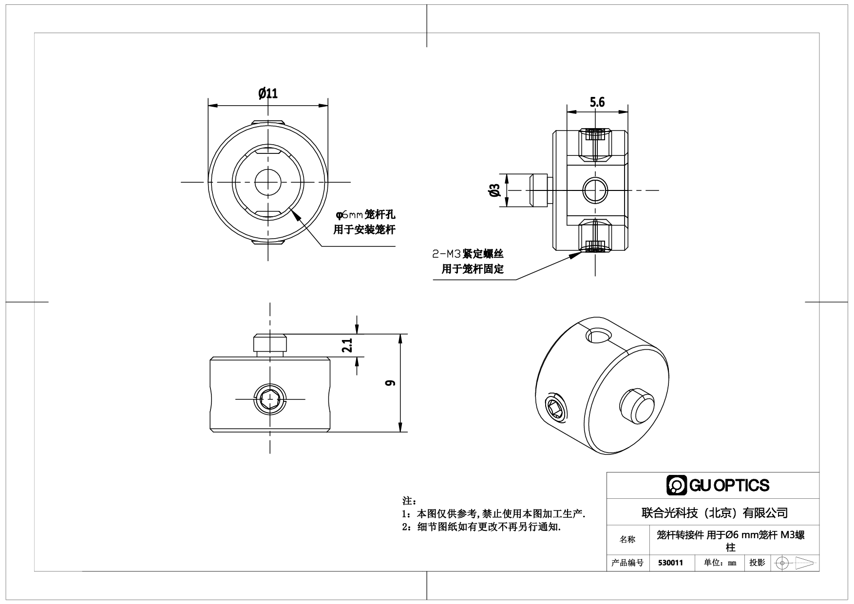 联合光科笼杆转接件一端为螺柱,另一端为内径Φ6mm,深度为5.6mm盲孔。有4-40螺柱和M3螺柱两种类型可选,兼容带4-40或M3内螺纹组件,适用于连接Φ6mm的笼式接杆。侧面附带M3紧定螺丝用于固定Φ6mm的笼式接杆。侧面带Φ1.8mm贯穿孔,1.5mm扳手贯穿加固连接。两个端面都是螺纹孔的笼式系统组件连接时,将笼式接杆转接件拧在其中一个组件上,笼式接杆一端拧在另一个组件上,一端插入笼式接杆转接件,实现笼式串接。