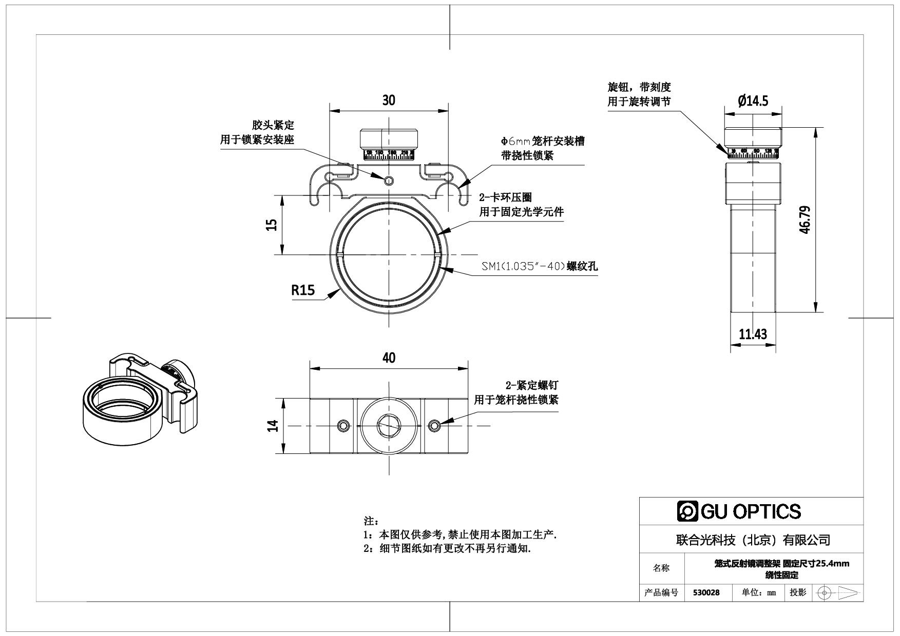 5. 530027光学元件固定方式:顶丝,适用安装Φ25.4mm,最小厚度为3mm的光学元件;