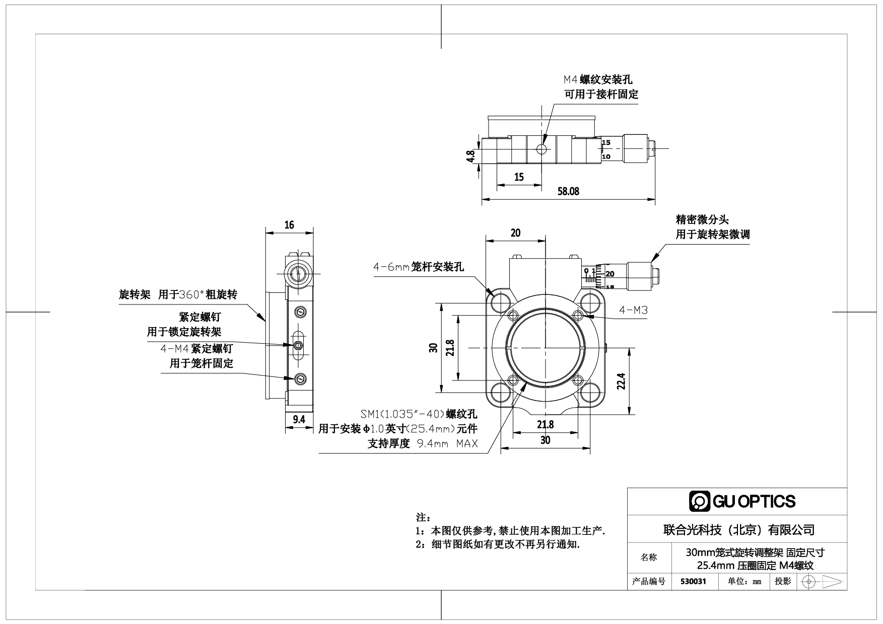 30mm笼式旋转调整架 固定尺寸25.4mm 压圈固定 M4螺纹(微分头驱动)