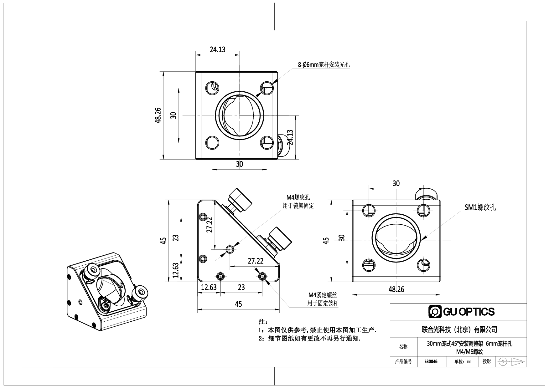 530046和530047兼容30mm笼式系统,适合搭建紧凑型系统。该镜架入射和出射端面均带有一个SM1螺纹孔,兼容Φ25.4mm透镜套筒,斜面用于安装Φ25.4mm最小厚度3mm光学元件,锁紧螺丝固定。带三个调节器,实现±3°俯仰和倾斜角度调节,±2.5mm线性位移调节。入射端面和出射端面相互垂直。提供入射端面和出射端面Φ6mm同轴接杆固定安装方式。