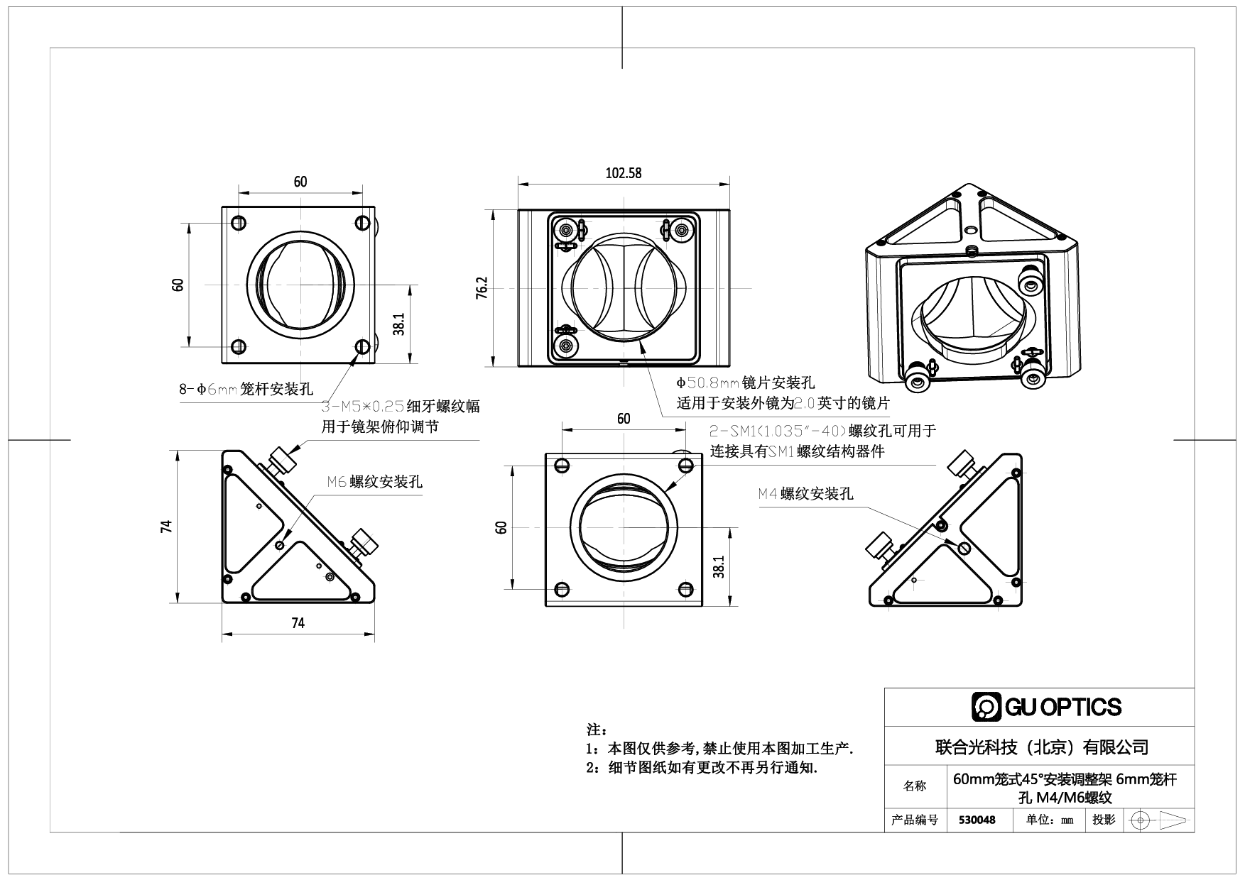 1. 530048和530049适用安装Φ50.8mm最小厚度6mm光学元件;