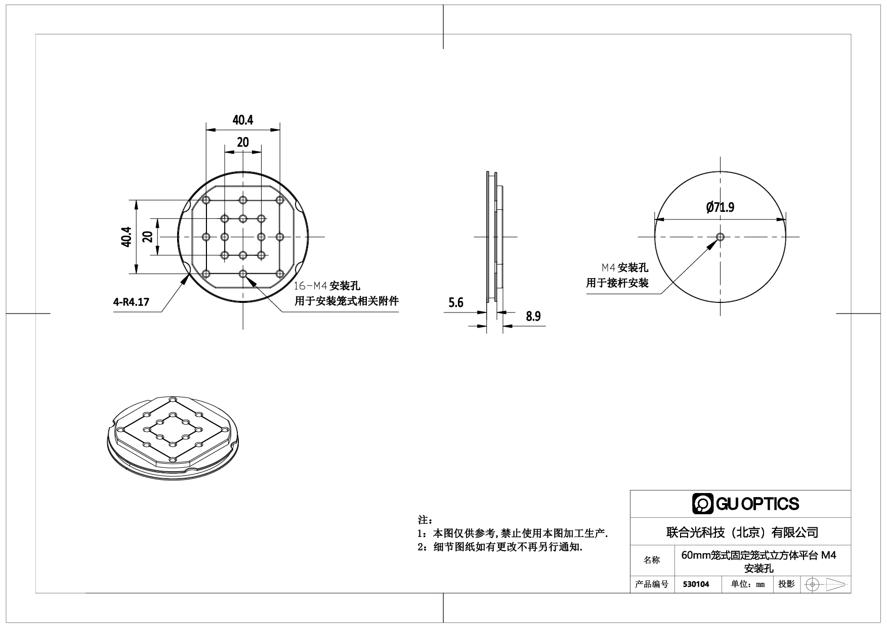 联合光科的60mm笼式立方体,适用于在60mm的笼式系统中安装光学元件,笼式立方体的侧面带有四个SM2的螺纹口,便于连接具有SM2螺纹的结构件。SM2螺纹端口周围还有四个M3的螺孔,用于笼式立方体及其配件的固定。530102两个相对的面有φ6mm的通孔,用于连接φ6mm的笼杆,同时旁边的M4紧定螺丝用于固定笼式接杆。60mm笼式固定笼式立方体平台530104底部有M4螺纹孔,可以支撑棒连接,端面有M44螺孔,可以跟笼式链接,配合60mm笼式立方体530103和530102使用。联合光科光学笼式系统的性价比高,组装、移动顺畅,刚性好,为您提供调整、定位、倾斜安装等各类组件,便于调整光路。